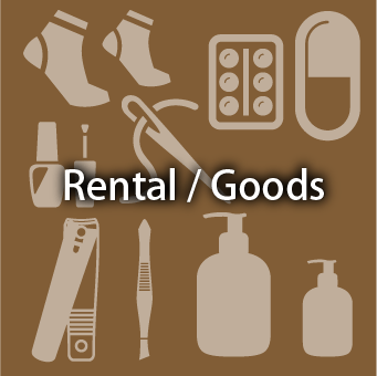 常備薬、爪切り・毛抜き、ソーイングセット、除光液などの日常品を無料貸出しております。また、急な宿泊時などに必要な、下着、ストッキング、靴下、ビニール傘、コンタクト保存液などを 取り揃え、館内販売しています。